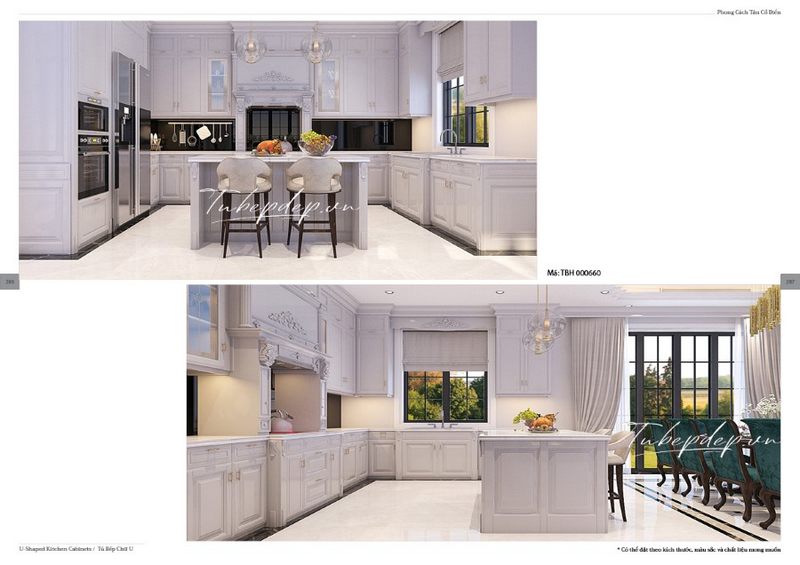 Các góc nhìn khác nhau của mẫu thiết kế phòng bếp màu trắng phong cách tân cổ điển có hệ thống tủ bếp chạm khắc nghệ thuật trong không gian nhà phố, biệt thự.