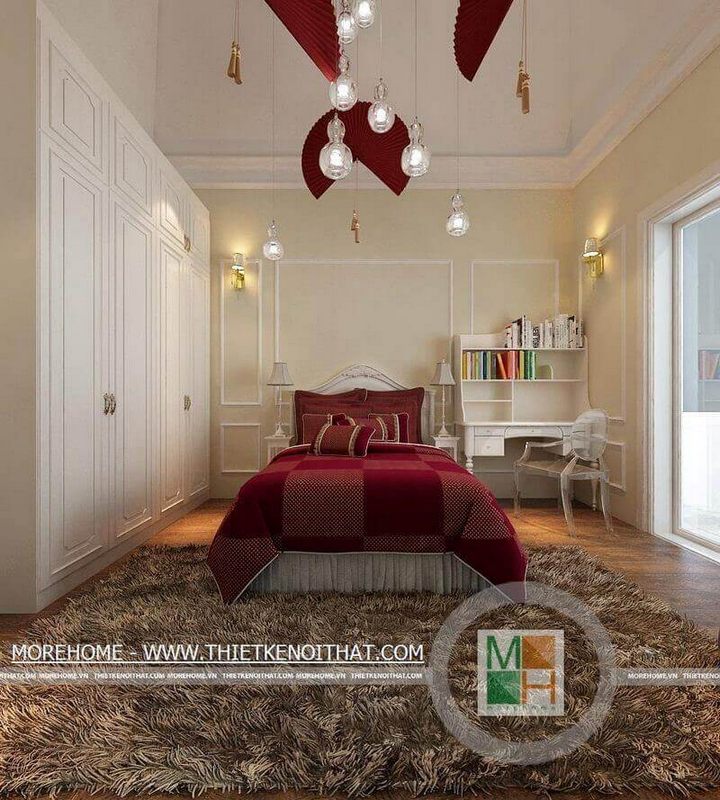 . Không gian nghỉ ngơi trong phòng ngủ Master được trang trí đầy ấn tượng và độc đáo, nội thất gỗ tự nhiên được phun sơn trắng cao cấp mang lại một cảm giác thoải mái, sang trọng và có chiều sâu hơn.