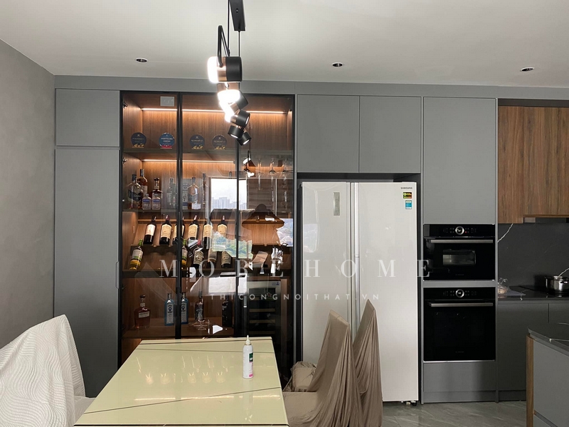 Thi công tủ rượu cánh kính trưng bày sắp xếp những chai rượu ngoài ra còn có chức năng trang trí ấn tượng cho căn phòng